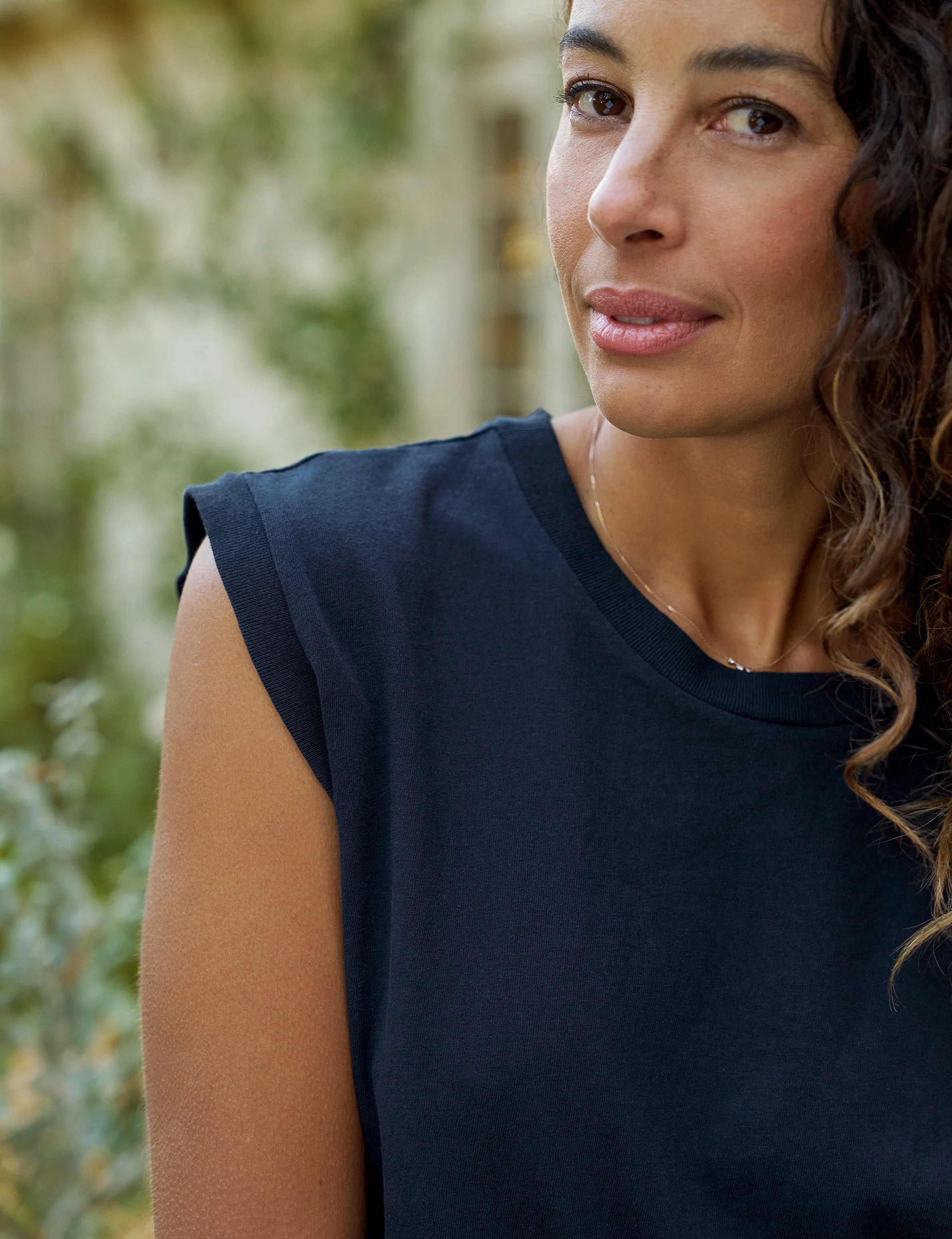 Our vintage-inspired Muscle Tee has a relaxed, boxy silhouette that hangs beautifully against the torso. Tiny cap sleeves and a raw edge hem add a stylish pop of detail.