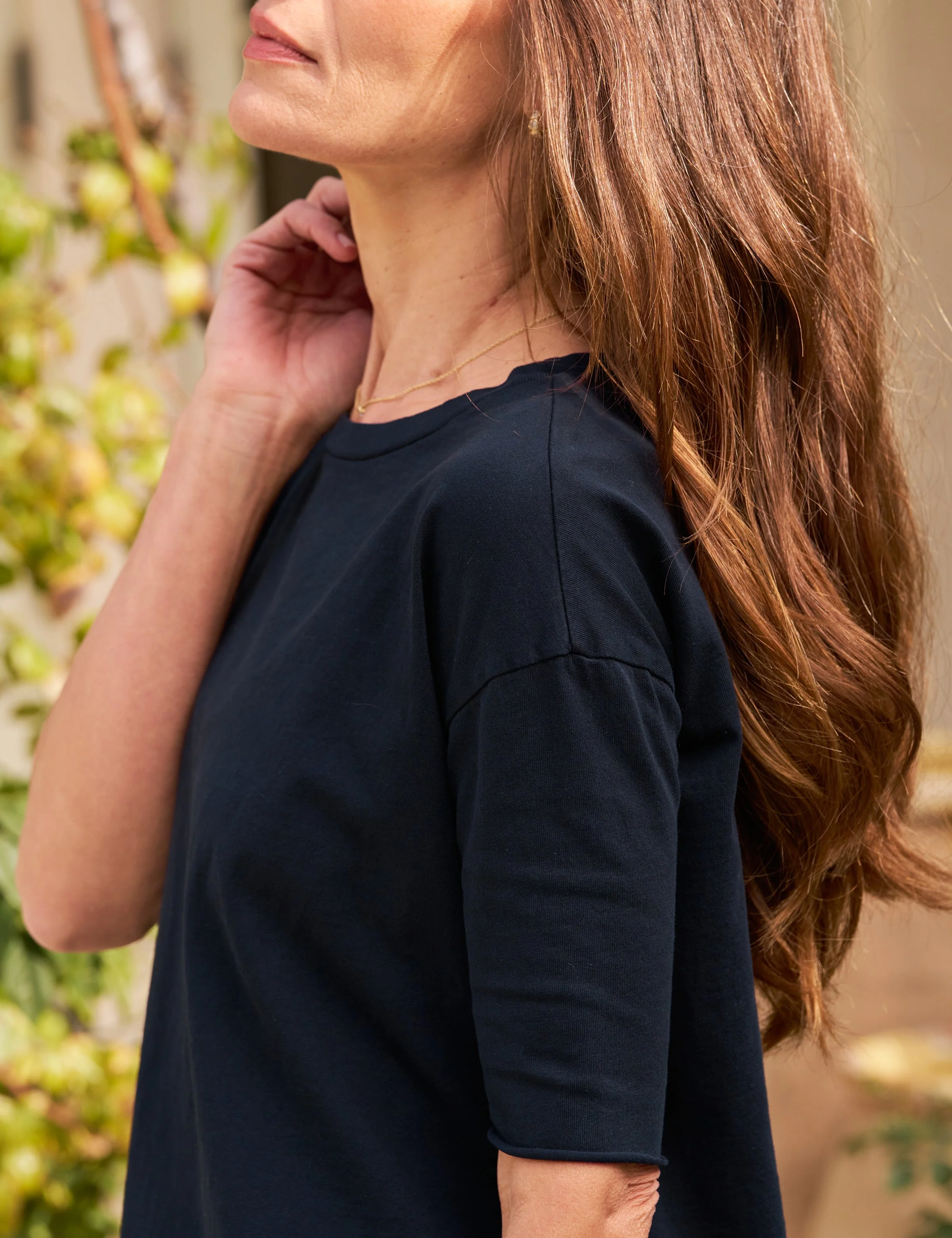 This is the French girl-inspired tee you’ll reach for on the regular. Relaxed but never slouchy, it’s one of those perfect-fitting styles that looks instantly cool. Sure, our signature raw hem (which hits right below the hips) is flattering, but the elbow-length sleeves make this piece a daily uniform staple.